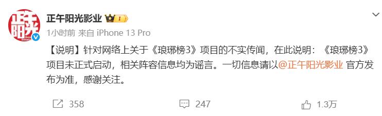 12日晚,正午陽(yáng)光影業(yè)官方微博發(fā)文回應(yīng)此事:“《瑯琊榜3》項(xiàng)目未正式啟動(dòng),相關(guān)陣容信息均為謠言。”