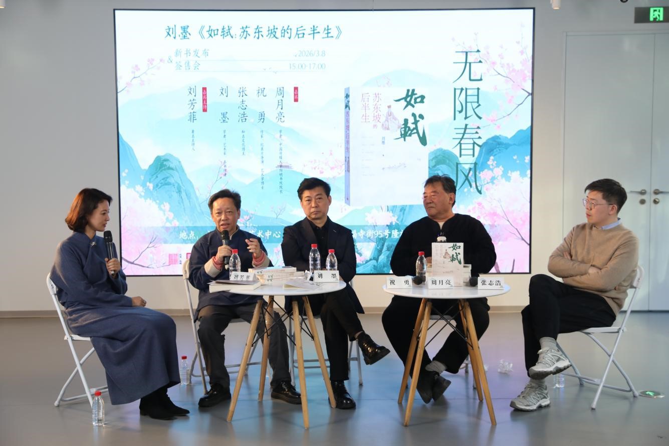 3月8日,“無(wú)限春風(fēng)——《如軾:蘇東坡的后半生》新書(shū)發(fā)布暨簽售會(huì)”在北京舉行。中國(guó)出版集團(tuán)黨組成員、中國(guó)出版?zhèn)髅焦煞萦邢薰靖笨偨?jīng)理、人民文學(xué)出版社社長(zhǎng)臧永清出席發(fā)布會(huì)并致辭。學(xué)者、中國(guó)傳媒大學(xué)陽(yáng)明書(shū)院院長(zhǎng)周月亮,作家、紀(jì)錄片導(dǎo)演、藝術(shù)學(xué)博士祝勇,知名文化博主張志浩,作者劉墨等學(xué)者在發(fā)布會(huì)上進(jìn)行了精彩對(duì)談。發(fā)布會(huì)由主持人劉芳菲主持。