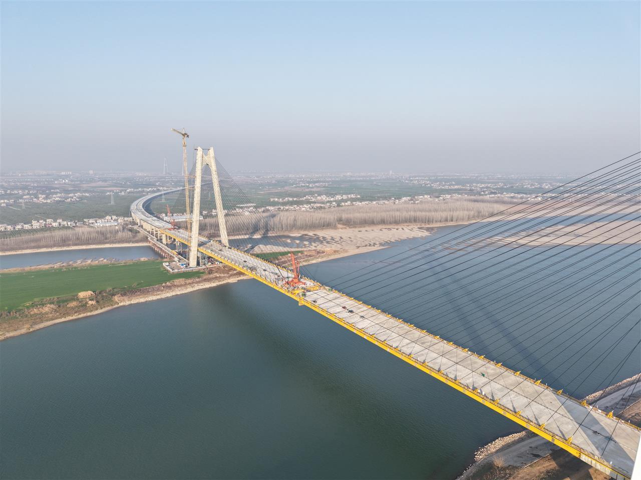 松滋河特大橋是當(dāng)枝松高速公路的控制性工程之一,連接著枝江市百里洲鎮(zhèn)與松滋市老城鎮(zhèn),是百里洲南向唯一高速公路交通通道,更是當(dāng)枝松高速串聯(lián)三地、貫通路網(wǎng)的核心樞紐。大橋全長995米、主跨555米,采用雙塔小邊箱組合混合梁斜拉橋結(jié)構(gòu),共設(shè)鋼組梁70節(jié)、斜拉索44對。兩岸主塔高169米,采用A字形結(jié)構(gòu),其中上橫梁裝飾板與塔柱相交,構(gòu)成“楚服衣領(lǐng)”造型,具有濃郁的楚文化風(fēng)格。
