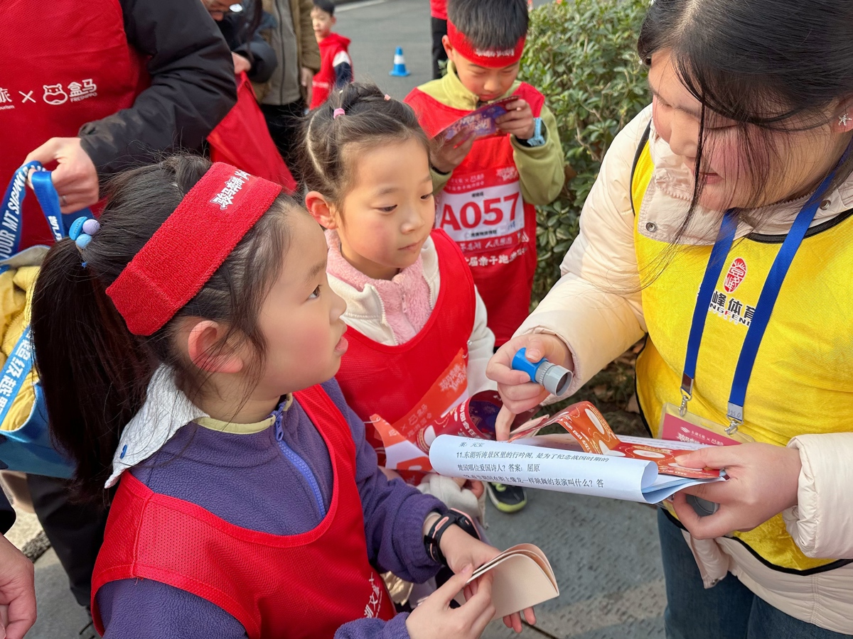 在綠道九女墩處的“答題贏章漲知識”環(huán)節(jié),孩子們圍在工作人員身邊踴躍回答趣味問題。“大雁冬天往哪飛?”“馬睡覺的時(shí)候是站著還是躺著的?”“太陽從哪邊升起來?”……一個(gè)個(gè)充滿童趣的提問引得現(xiàn)場笑聲不斷。每答對三題,工作人員便在任務(wù)卡上鄭重蓋章,孩子們舉起蓋滿印章的卡片,臉上洋溢著自豪的笑容。這場在湖畔開展的“自然課堂”,讓親子家庭在運(yùn)動中不僅鍛煉了身體,也收獲了知識與合作的喜悅。