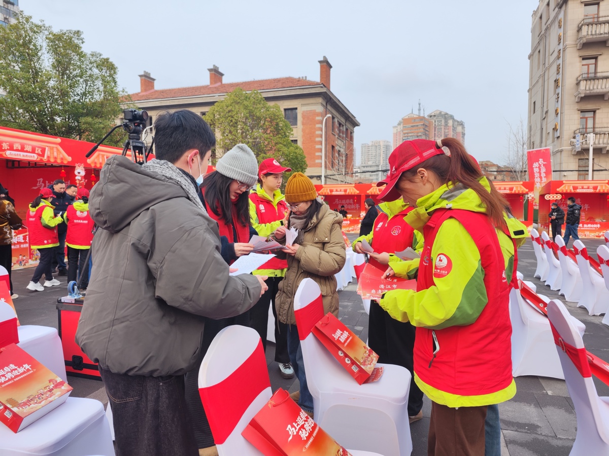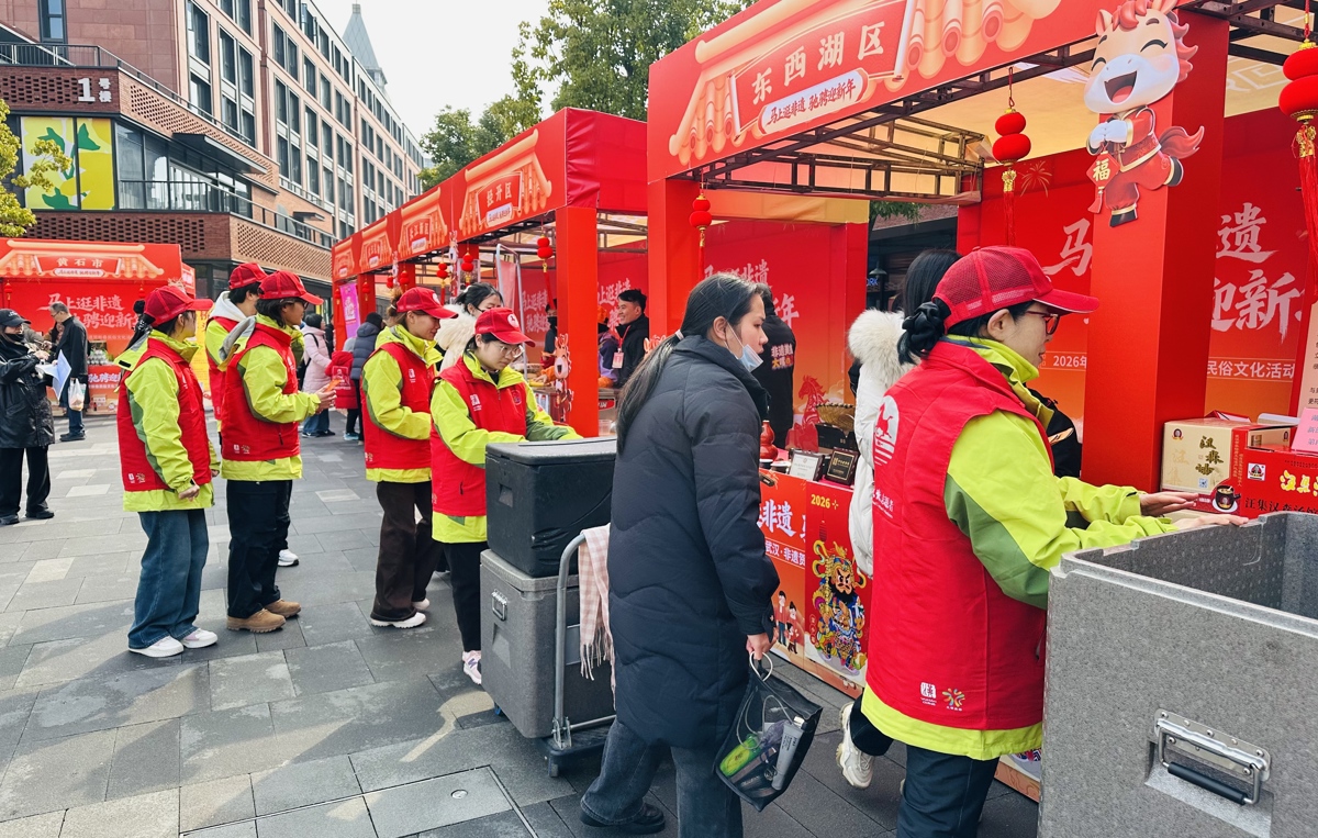 在活動主會場啟動儀式現(xiàn)場,武漢文旅志愿者以專業(yè)、貼心的服務全程護航。這群紅馬甲穿梭于各個服務點位,引導嘉賓、維護秩序、講解非遺、分發(fā)物料,用貼心舉動溫暖來賓與游客,成為荊楚非遺與新春年味交融中的一道暖光。