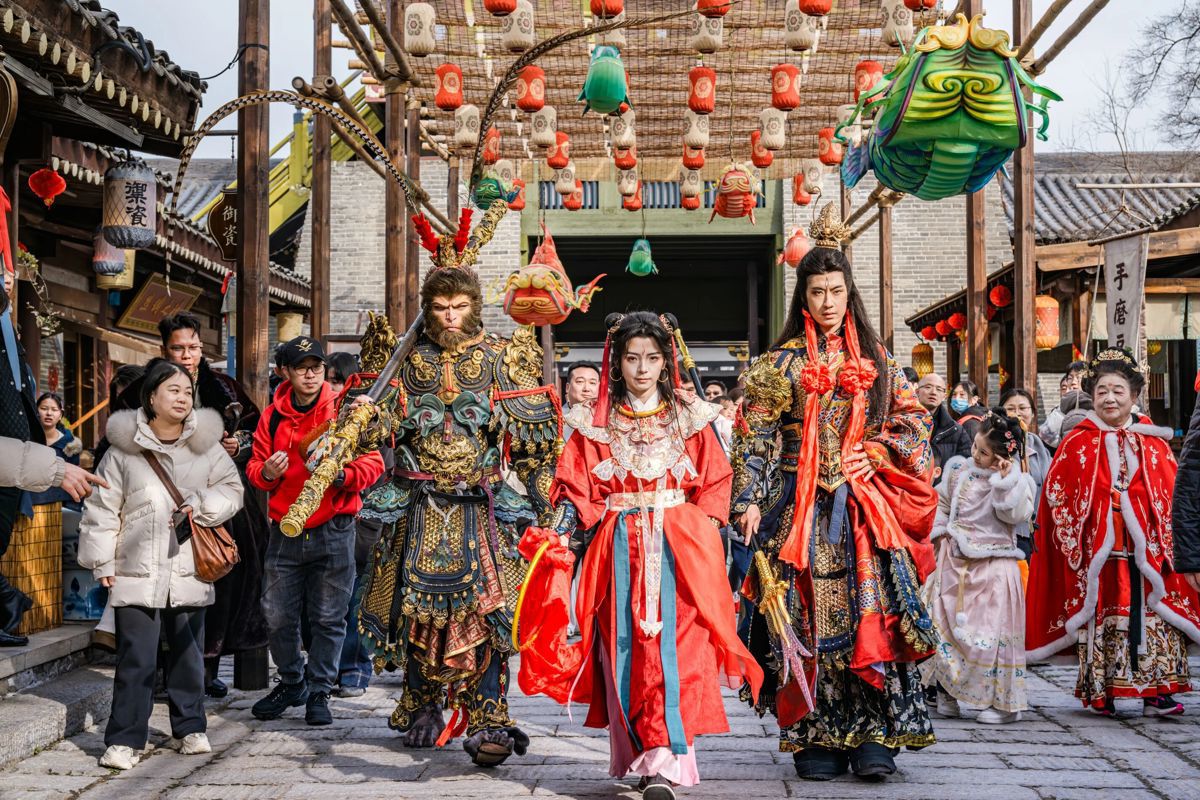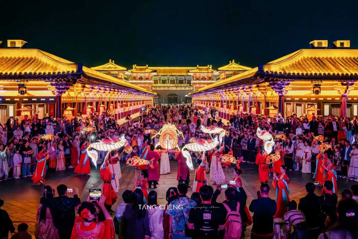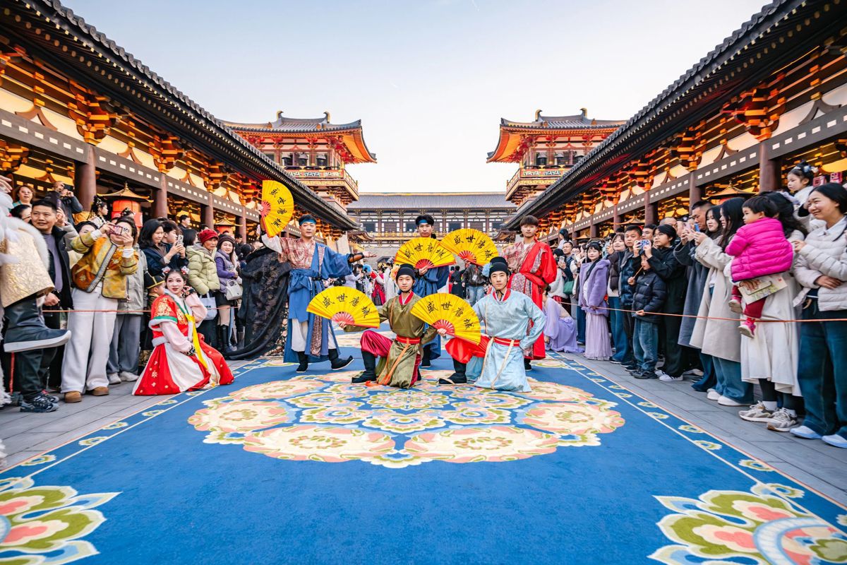 唐城景區(qū)“紅火唐城?馬到成功”新春嘉年華推出20米廣州全運(yùn)會同款巨型鰲魚巡游,國潮Live秀、唐潮奇妙Show驚喜不斷。非遺、演藝、陽光、笑臉與唐風(fēng)古韻在此交融,“人在畫中游,年在景中過”的盛世畫卷徐徐鋪展。東西市舞臺上,《盛唐百戲》《韶光春漫》《才子投壺》《市井雜?!贰抖鼗臀琛返染恃莩鲆糜慰婉v足鼓掌。甕城的《盛唐百戲?單騎旋風(fēng)》《盛唐百戲?雙輪翔舞》《天塔舞獅》讓大人孩子齊聲驚嘆,非遺技藝躍然眼前。來自武漢的游客陳先生帶著家人而來,“既有傳統(tǒng)年味,又有新潮體驗(yàn),孩子玩得特別開心,比往年單純逛景區(qū)有意思多了。”