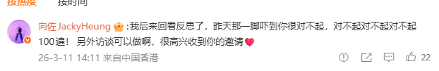 向佐也在評論區(qū)道歉:我后來回看反思了,昨天那一腳嚇到你很對不起,對不起對不起對不起100遍! 另外訪談可以做啊,很高興收到你的邀請。